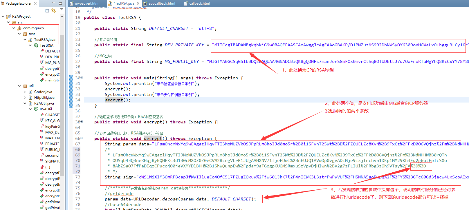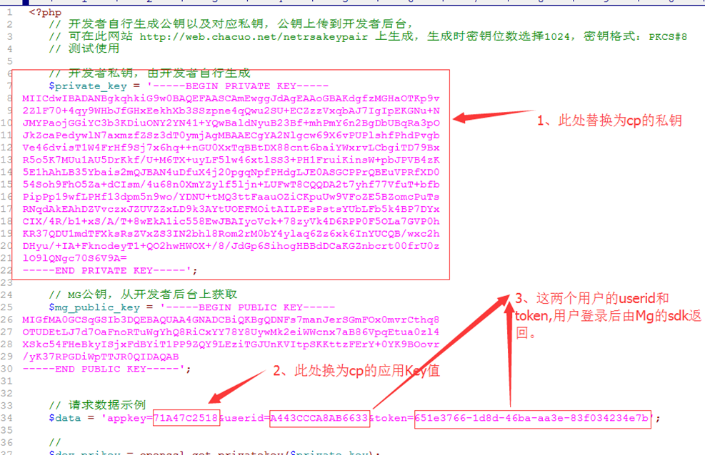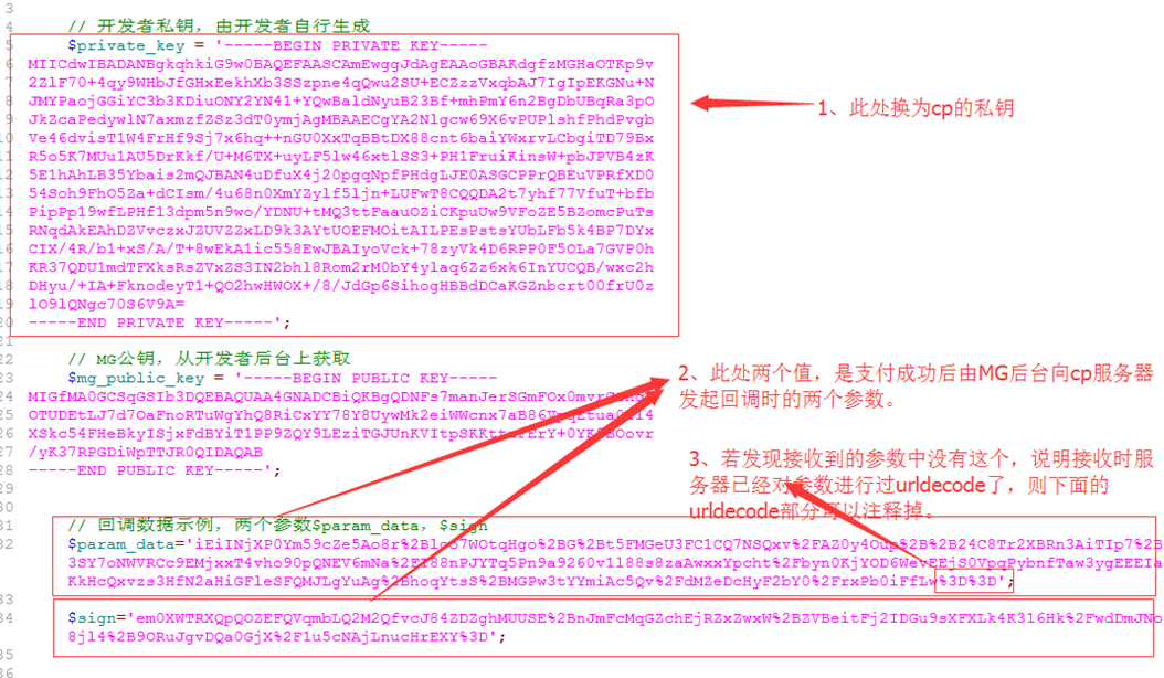 - When decrypting, first get param_data and sign parameters, first line URLDecode (< b > < font color = "red" > some servers will automatically receive URLDecode, if it has been processed, this step can be omitted < / font > < b >), then base64decode, and then RSA decryption. When RSA decrypts, please use 128 bytes to decrypt (that is, decompose the parameter value according to 128 bytes for RSA decryption, and then splice the decrypted string). MG background has sample code for reference。