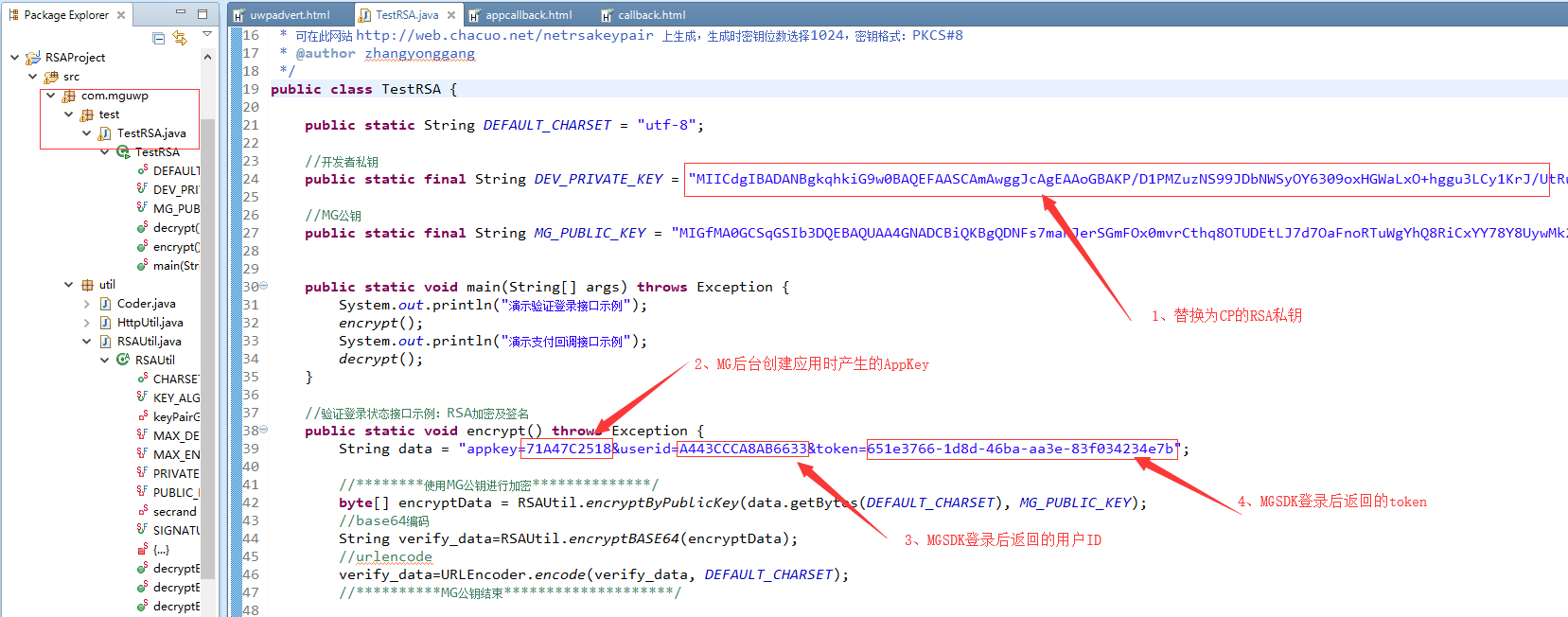 - The system involves four RSA keys: MG public key, MG private key, developer public key and developer private key。
